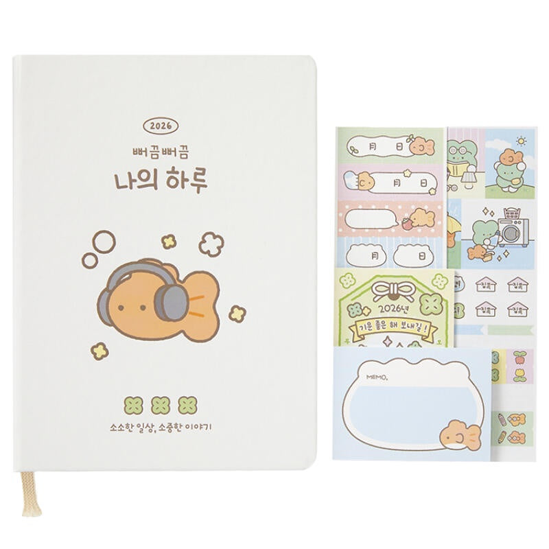 Start your 2026 with the Bbeokkeum Bbeokkeum My Day – Clover Diary, featuring the adorable orange goldfish “Bbeokkeumi,” a symbol of luck and happiness. This charming planner is designed with playful illustrations and thoughtful pages to help you capture every moment of your year with joy and positivity.