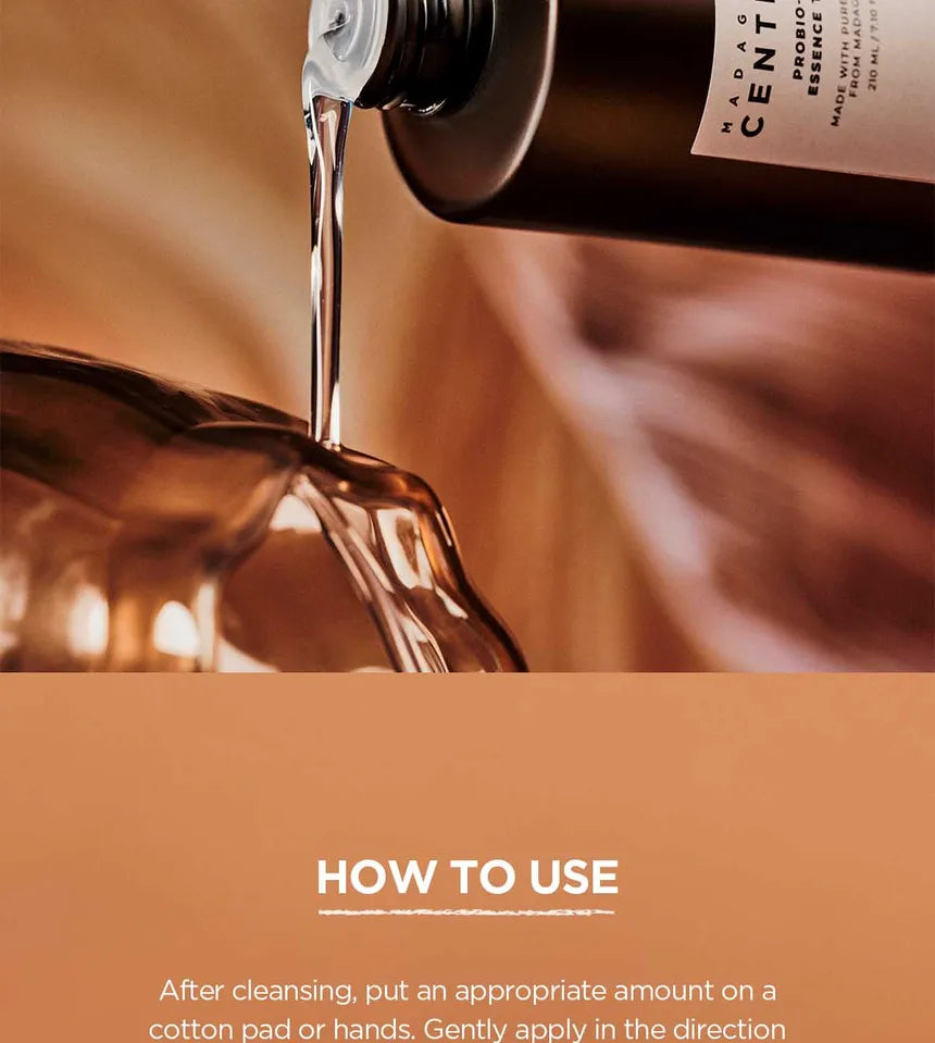 Apply an appropriate amount to either a cotton pad or directly on the palm and gently pat to absorb into the skin.