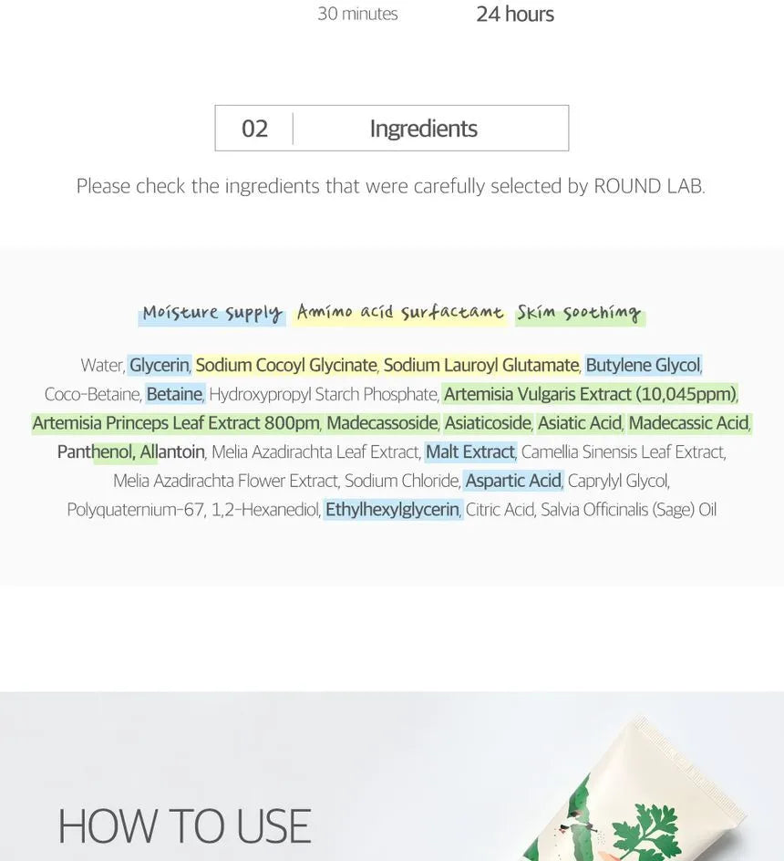 Water, Glycerin, Sodium Cocoyl Glycinate, Sodium Lauroyl Glutamate, Butylene Glycol, Coco-Betaine, Betaine, Hydroxypropyl Starch Phosphate, Artemisia Vulgaris Extract (10,045ppm), Artemisia Princeps Leaf Extract 800pm, Madecassoside, Asiaticoside, Asiatic Acid, Madecassic Acid, Panthenol, Allantoin, Melia Azadirachta Leaf Extract, Malt Extract, Camellia Sinensis Leaf Extract, Melia Azadirachta Flower Extract, Sodium Chloride, Aspartic Acid, Caprylyl Glycol, Polyquaternium-67, 1,2-Hexanediol, Ethylhexylglycerin, Citric Acid, Salvia Officinalis (Sage) Oil