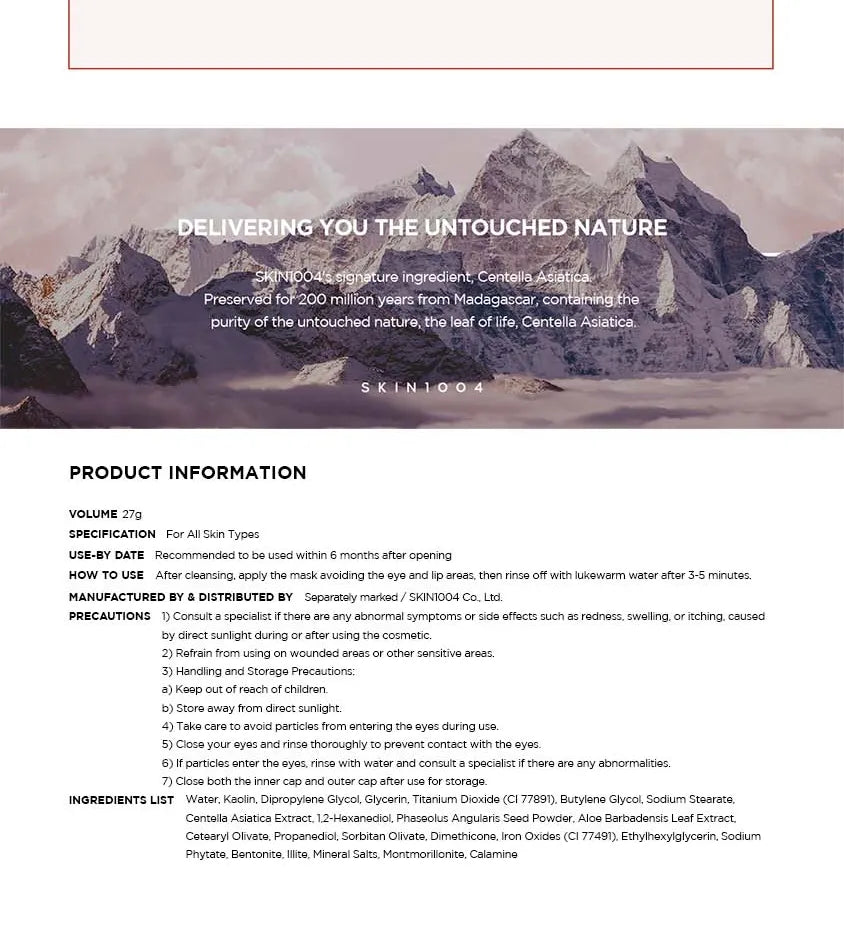Water, Kaolin (8%), Dipropylene Glyco, Glycerin, Titanium Dioxide (CI 77891), Butylene Glycol, Sodium Stearate, Centella Asiatica Extract (4.9%), 1,2-Hexanediol, Phaseolus Angularis Seed Powder, Aloe Barbadensis Leaf Extract, Cetearyl Olivate, Propanediol, Sorbitan Olivate, Dimethicone, Iron Oxides (CI 77491), Ethylhexylglycerin, Sodium Phytate, Bentonite, Lllite, Mineral Salts, Montmorillonite, Calamine