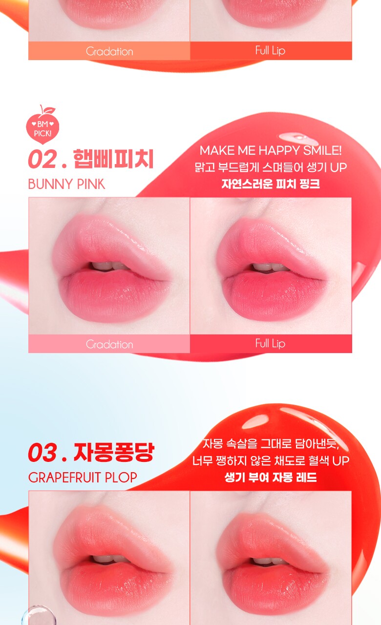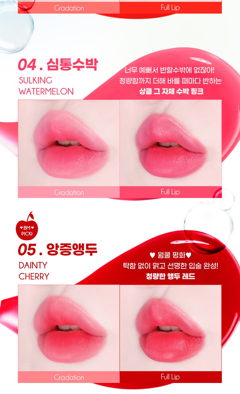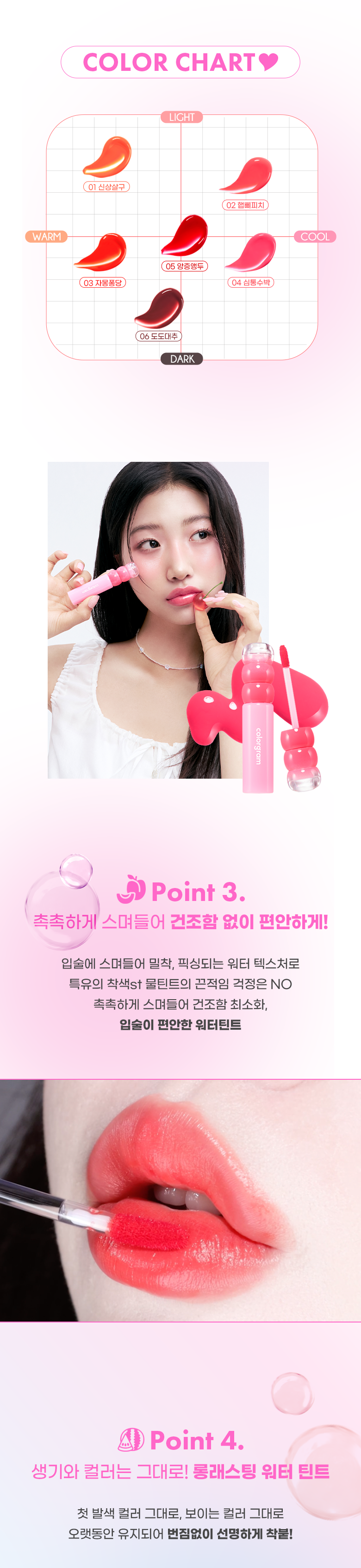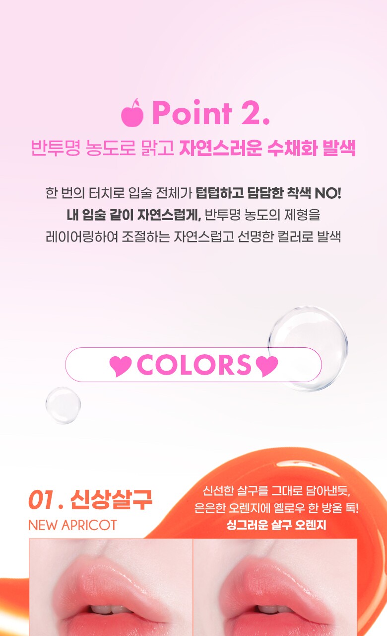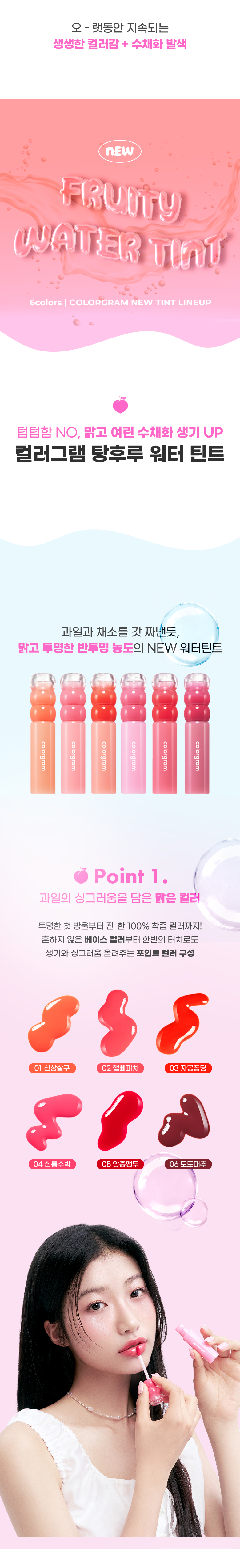 COLORGRAM Fruity Water Tint is a water-based lip tint that creates a natural watercolor finish. It offers buildable, sheer color for everyday wear and can be customized from subtle to vibrant.
