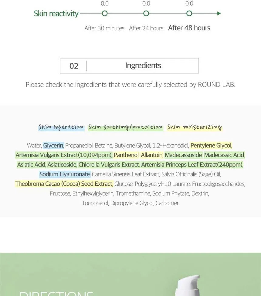 Water, Glycerin, Propanediol, Betaine, Butylene Glycol, 1,2- Hexanediol, Pentylene Glycol, Artemisia Vulgaris Extract(10,094ppm), Panthenol, Allantoin, Madecassoside, Madecassic Acid, Asiatic Acid, Asiaticoside, Chlorella Vulgaris Extract, Artemisia Princeps Leaf Extract(240ppm), Sodium Hyaluronate, Camellia Sinensis Leaf Extract, Salvia Officinalis (Sage) Oil, Theobroma Cacao (Cocoa) Seed Extract, Glucose, Polyglyceryl-10 Laurate, Fructooligosaccharides, Fructose, Ethylhexylglycerin, Tromethamine, Sodium Phytate, Dextrin, Tocopherol, Dipropylene Glycol, Carbomer