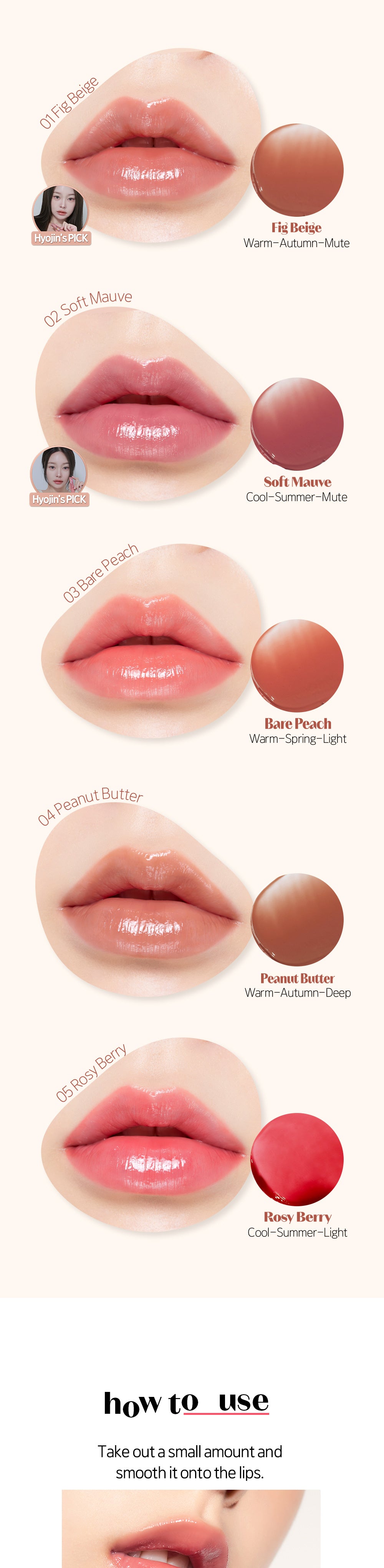 Moisturizing and comfortable clear glossy lip balm. Create a clear and transparent watery glow without stickiness with a high refractive index oil.