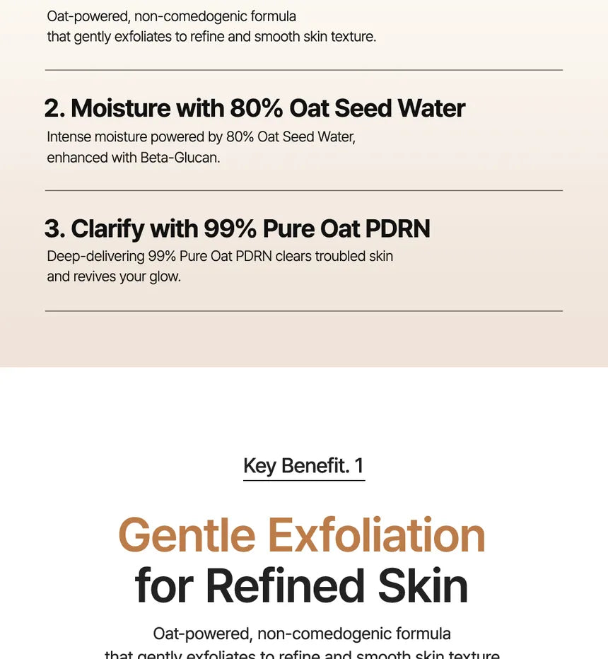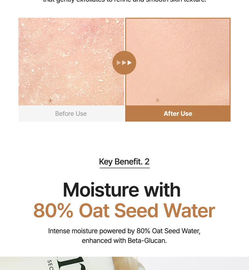 • Offers gentle exfoliation for refined skin and intense moisture filling with the 80% Oat Seed Water, enhanced with Beta-Glucan.