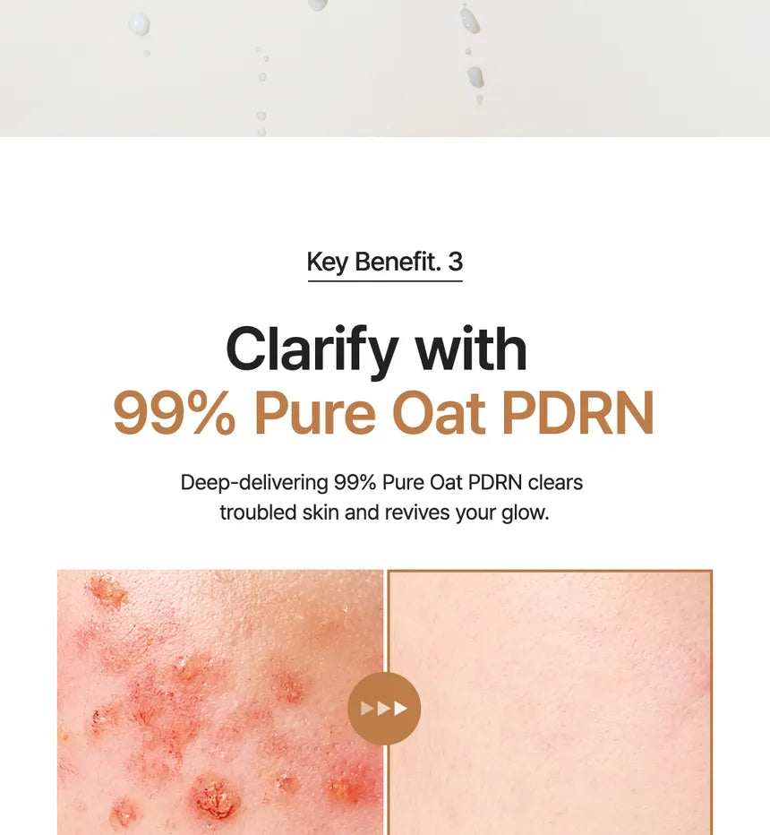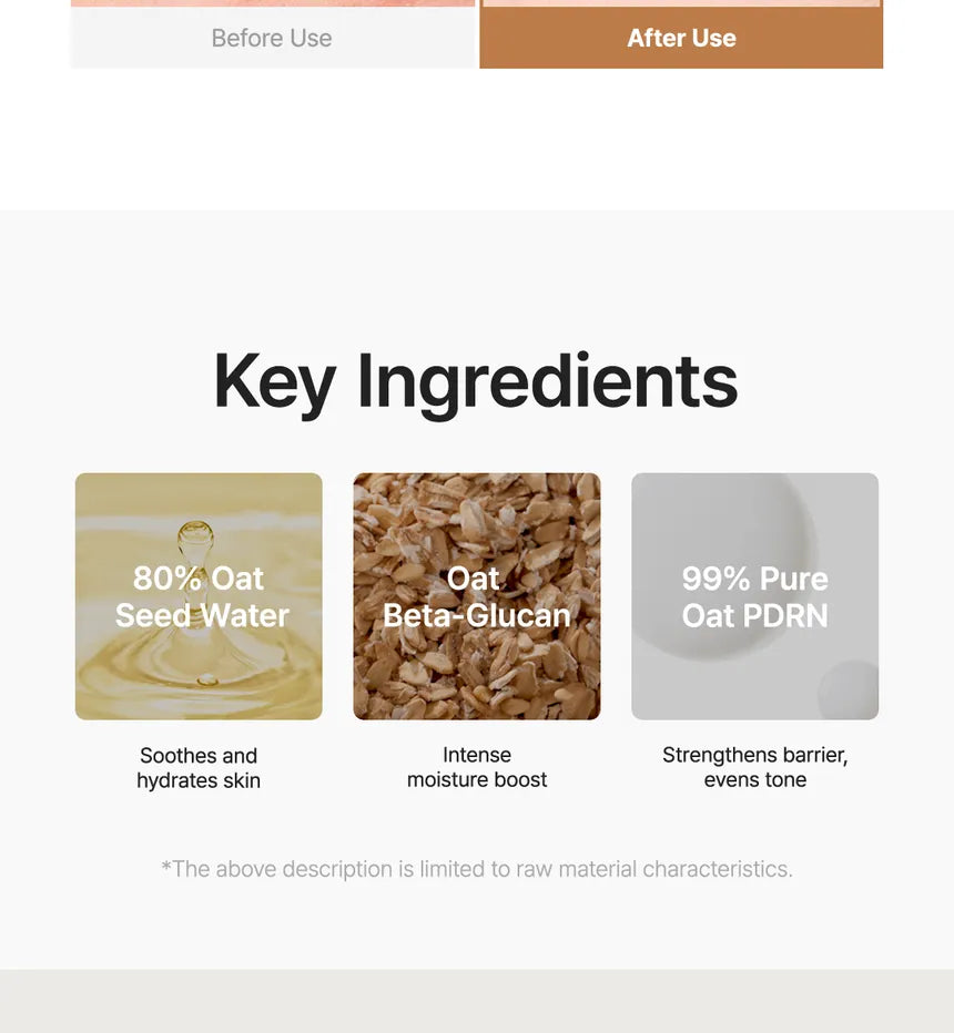 • 99% Pure Oat PDRN stregthens barrier, evens tone the dull skin.