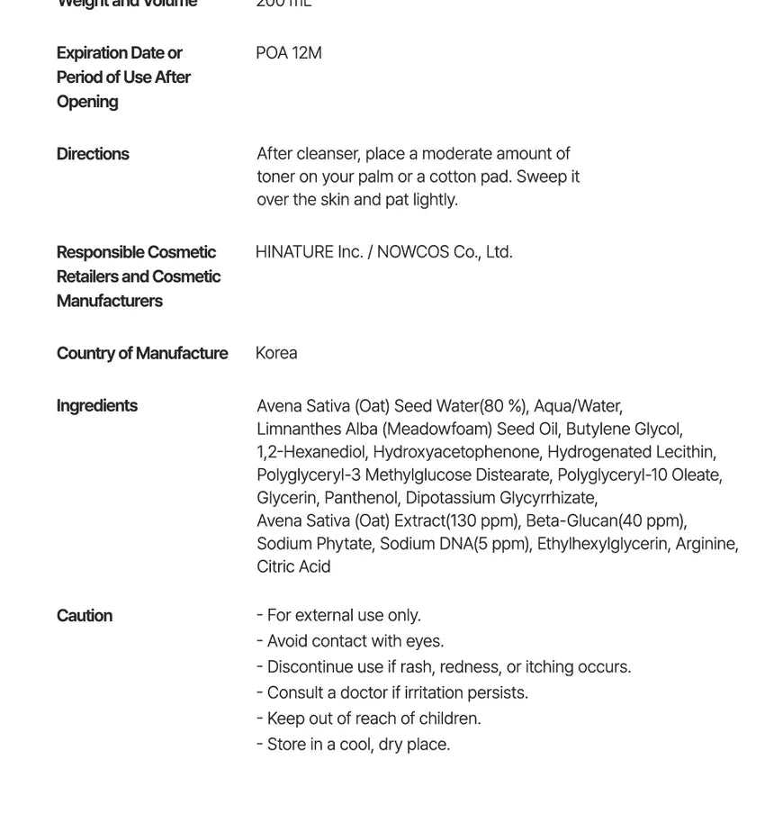• Avena Sativa (Oat) Seed Water, Water, Butylene Glycol, Glycerin, 1,2-Hexanediol, Hydrogenated Lecithin, Panthenol, Hydroxyacetophenone, Glyceryl Stearate, Ceramide NP, Dipotassium Glycyrrhizate, Ethylhexylglycerin, Avena Sativa (Oat) Extract, Beta-Glucan, Sodium Phytate, Sodium DNA, Arginine, Citric Acid