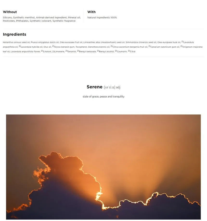 Helianthus Annuus Seed Oil, Prunus Amygdalus Dulcis Oil,, Olea Europaea Fruit Oil, Limnanthes Alba (Meadowfoam) Seed Oil, Simmondsia Chinensis Seed Oil, Olea Europaea Husk Oil, Lavandula Angustifolia Oil, Lavandula Hybrida Oil, Olus Oil, Styrax Benzoin Gum, Tocopherol, Oenothera Biennis Oil, Citrus Aurantium Bergamia Fruit Oil, Canarium Luzonicum Gum Oil, Origanum Majorana Leaf Oil, Linalool(Ingredient In Lavender Oil), Limonene, Geraniol, Benzyl Benzoate, Benzyl AlcoholCoumarin, Citral