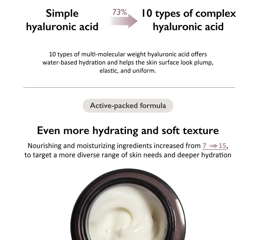 Water, Caprylic/Capric Triglyceride, Carthamus Tinctorius (Safflower) Seed Oil, Oenothera Biennis (Evening Primrose) Oil, Propanediol, Sorbitan Olivate, Cetearyl Olivate, Polyglyceryl-3 Stearate, Oryza Sativa (Rice) Extract(10,000ppm), Cetearyl Alcohol, Glycerin, Sunflower Seed Oil Glycerides, Aspergillus Ferment, Zanthoxylum Piperitum Fruit Ex- tract, Usnea Barbata (Lichen) Extract, Pulsatilla Koreana Extract, Phyllostachys Pubescens Shoot Bark Extract(2,000ppm), Cetyl Palmitate, Sodium Gluconate, Sorbitan Palmitate, 1,2-Hexanediol, Xanthan Gum, Panax Ginseng Root Extract, Sodium Hyaluronate(240ppm), Butylene Glycol, Potassium Hyaluronate (20ppm), Hydroxypropyltrimonium Hyaluronate (20ppm), Hydrolyzed Sodium Hyaluronate (20ppm), Hydrolyzed Hyaluronic Acid(20ppm), Hyaluronic Acid(20ppm), Pentylene Glycol, Cyclodextrin, Sodium Hyaluronate Crosspolymer(4ppm), Sodium Acetylated Hyaluronate(2ppm)