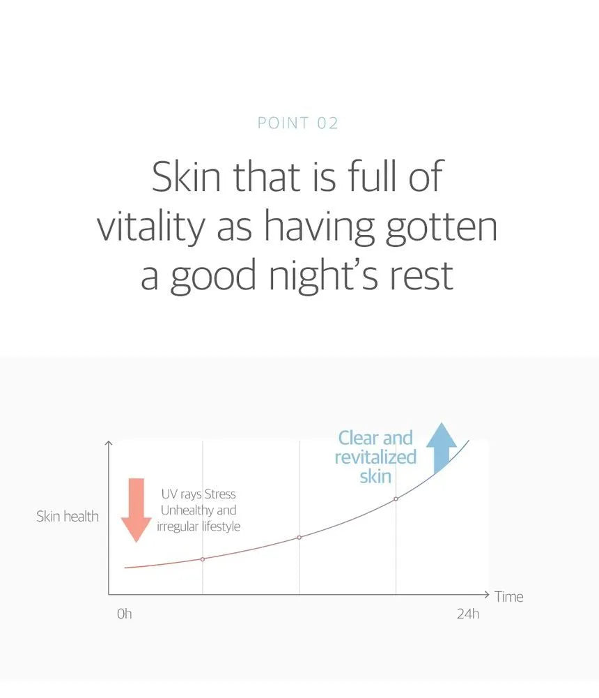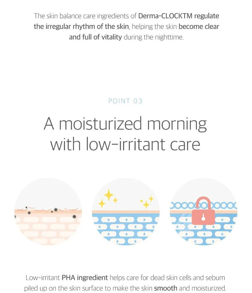 - Derma-CLOCK™ helps recover the disordered skin rhythm due to UV rays and external stress, restoring vitalized, clear skin during your sleep.