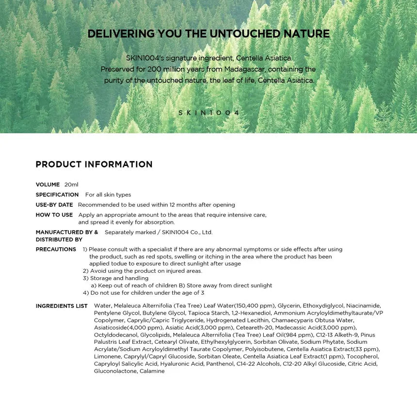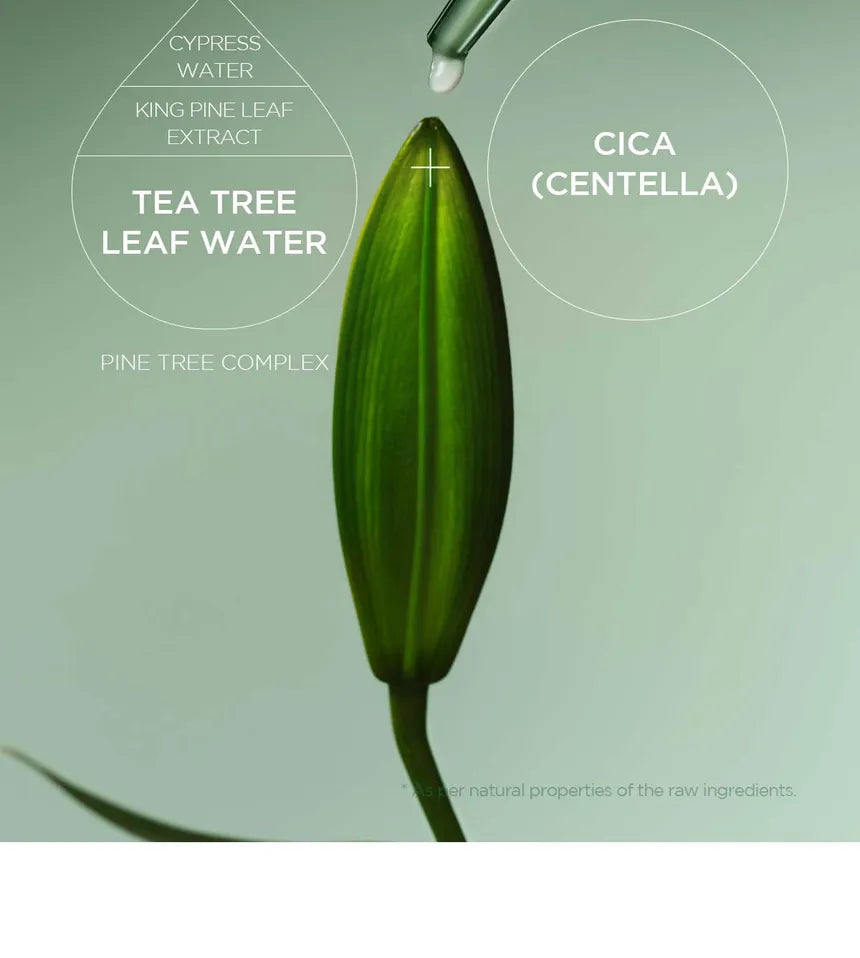 • Water, Melaleuca Alternifolia (Tea Tree) Leaf Water (15%), Butylene Glycol, Glycerin, Ethoxydiglycol, 1,2-Hexanediol, Dipropylene Glycol, Niacinamide, Caprylic/Capric Triglyceride, Propanediol, Ammonium Acryloyldimethyltaurate/VP Copolymer, Glycereth-26, Glyceryl Stearate, Neopentyl Glycol Diheptanoate, Octyldodecanol, Asiaticoside (0.4%), Panthenol, Asiatic Acid (0.3%), Cetearyl Olivate, Glycolipids, Hydrogenated Lecithin, Madecassic Acid (0.3%), C12-13 Alketh-9, Sorbitan Olivate, Melaleuca Alternifolia (Tea Tree) Leaf Oil (0.1%), Pentylene Glycol, Ethylhexylglycerin, Caprylyl Glycol, Chamaecyparis Obtusa Water, Pinus Palustris Leaf Extract, Disodium EDTA, Hyaluronic Acid, Hydrolyzed Hyaluronic Acid, Sodium Hyaluronate, Zea Mays (Corn) Kernel Extract, Ammonium Polyacryloyldimethyl Taurate, Gluconolactone, Centella Asiatica Extract (0.001%), Capryloyl Salicylic Acid, Fructan, Glucose, Calamine