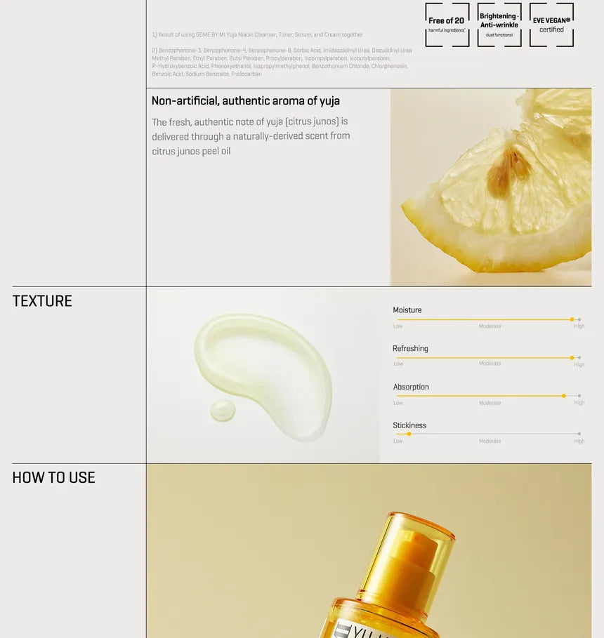Citrus Junos Fruit Extract [83%], Niacinamide [10%], Caprylic/Capric Triglyceride, 1,2-Hexanediol, Hydrogenated Poly(C6-14 Olefin), Alpha-Bisabolol, Carbomer, Arginine, Brassica Campestris (rapeseed) Seed Oil, Xanthan Gum, Ethylhexylglycerin, Adenosine, Citrus Junos Peel Oil [293.1 ppm], Melia Azadirachta Flower Extract, Ocimum Sanctum Leaf Extract, Glycyrrhiza Glabra (Licorice) Root Extract, Polyglyceryl-3 Diisostearate, Melia Azadirachta Flower Extract, Distilled Water, Curcuma Longa Root Extract, Corallina Officinalis Extract, Glycerin, Butylene Glycol, Althaea Officinalis Root Extract, Oryza Sativa (Rice) Bran Extract, 3-0-Ethyl Ascorbic Acid, Hydrogenated Lecithin, Ficus Carica(Fig) Fruit Extract, Punica granatum fruit Ext., Morus Alba Fruit Extract, Ginkgo biloba leaf extract, Tocopherols, Polyglyceryl-10 Stearate, Panthenol, Sodium Ascorbyl Phosphate, Biotin, Folic Acid, Pyridoxine, Cyanocobalamin, Linoleic acid, Riboflavin, Beta-Carotene, Inositol, Thiamine HCL, Disodium EDTA, Limonene, Linalool